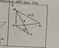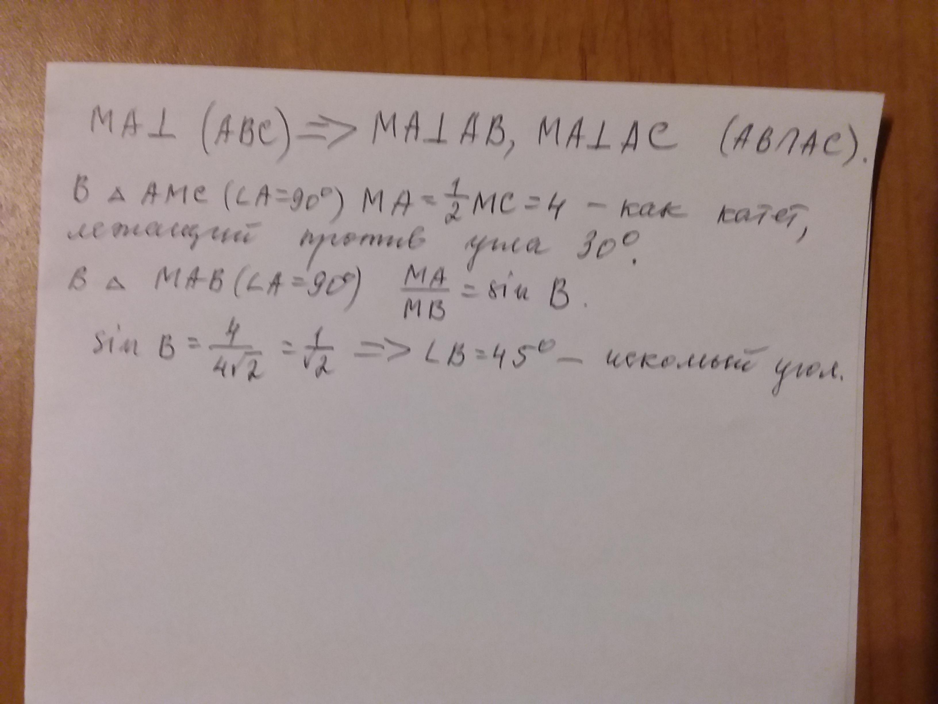 Пряма МА Перпендикулярна плоскости АВС. Найдите угол между прямой МВ и плоскостью АВС. С полным решением. (Кроме чертежа)