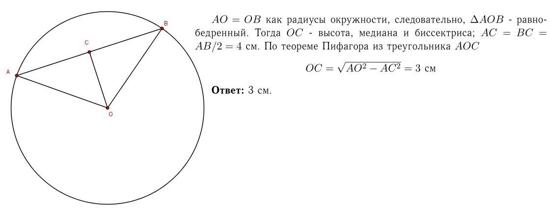 у колі радіуса 5 см проведено хорду. знайдіть відстань від центра кола до хорди, якщодовжина хорди дорівнює 8 см