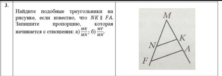 Найти: подобные треугольники и записать пропорцию, которая начинается с отношения а) МК : МN; б) МF : МN.