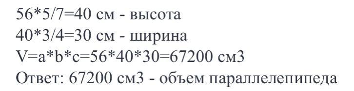 Длинна прямоугольного параллелепипеда равна 56 дм, высота составляет 5/7 длинны, а ширина 3/4 высоты. Вычислите объём параллелепипеда.