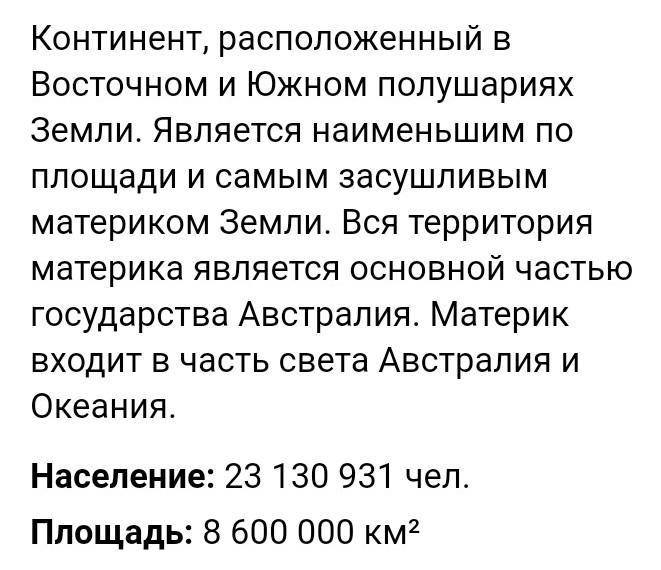 Ответ:Австралия – это страна, занимающая одноименный материк, который омывается Индийским и Тихим океанами. На побережьях континента находятся такие крупные города, как Сидней, Брисбен, Мельбурн, Перт и Аделаида. Столица Австралии – Канберра – расположена вдали от моря. Главными достопримечательностями страны являются Сиднейский оперный театр, Большой Барьерный риф и аутбэк – обширная пустынная местность. Также интересна фауна Австралии: здесь обитают уникальные виды животных, например кенгуру и утконосы.