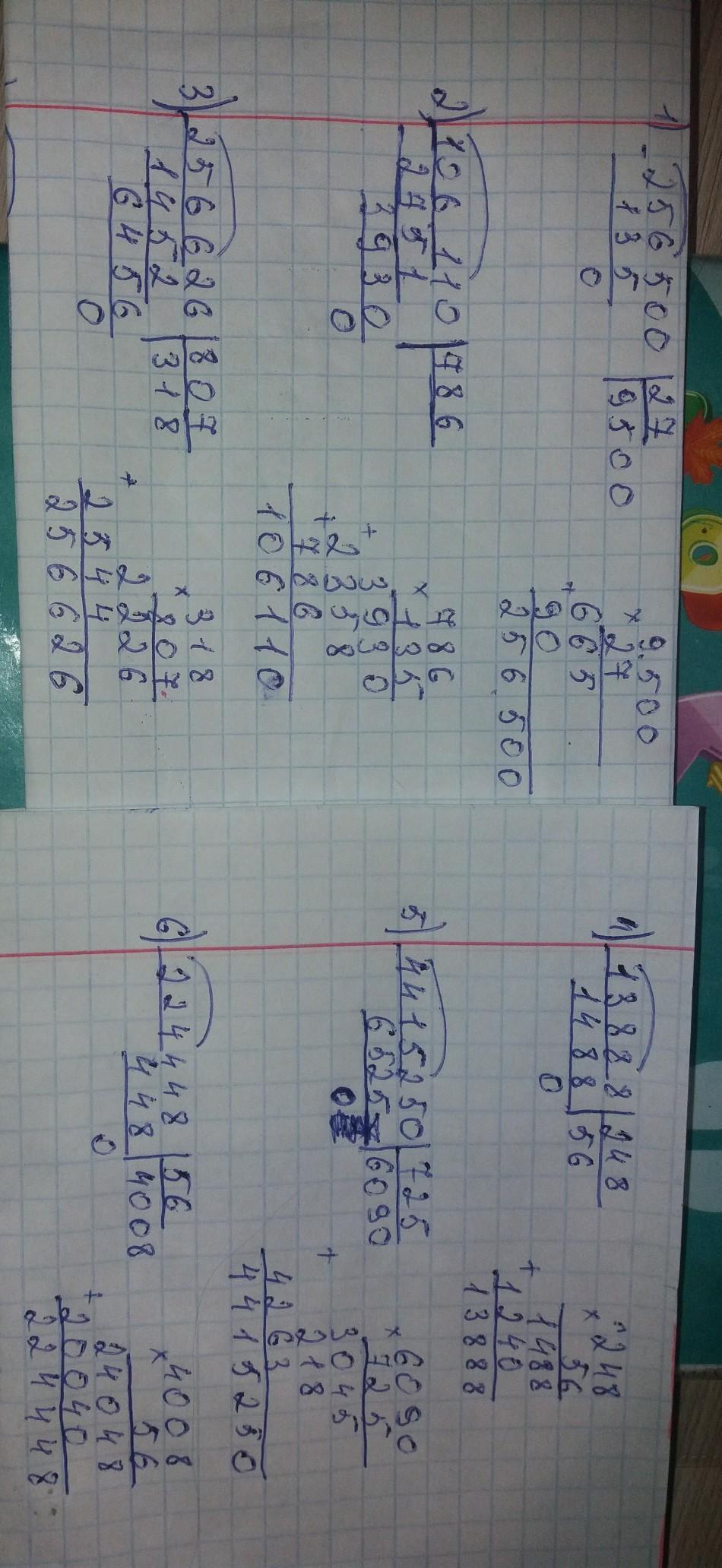 вычисли с проверкой 256500 : 27 ; 106110 : 786 ; 256626 : 807 ; 13888 : 248 ; 4415250 : 725 ; 224448 : 56