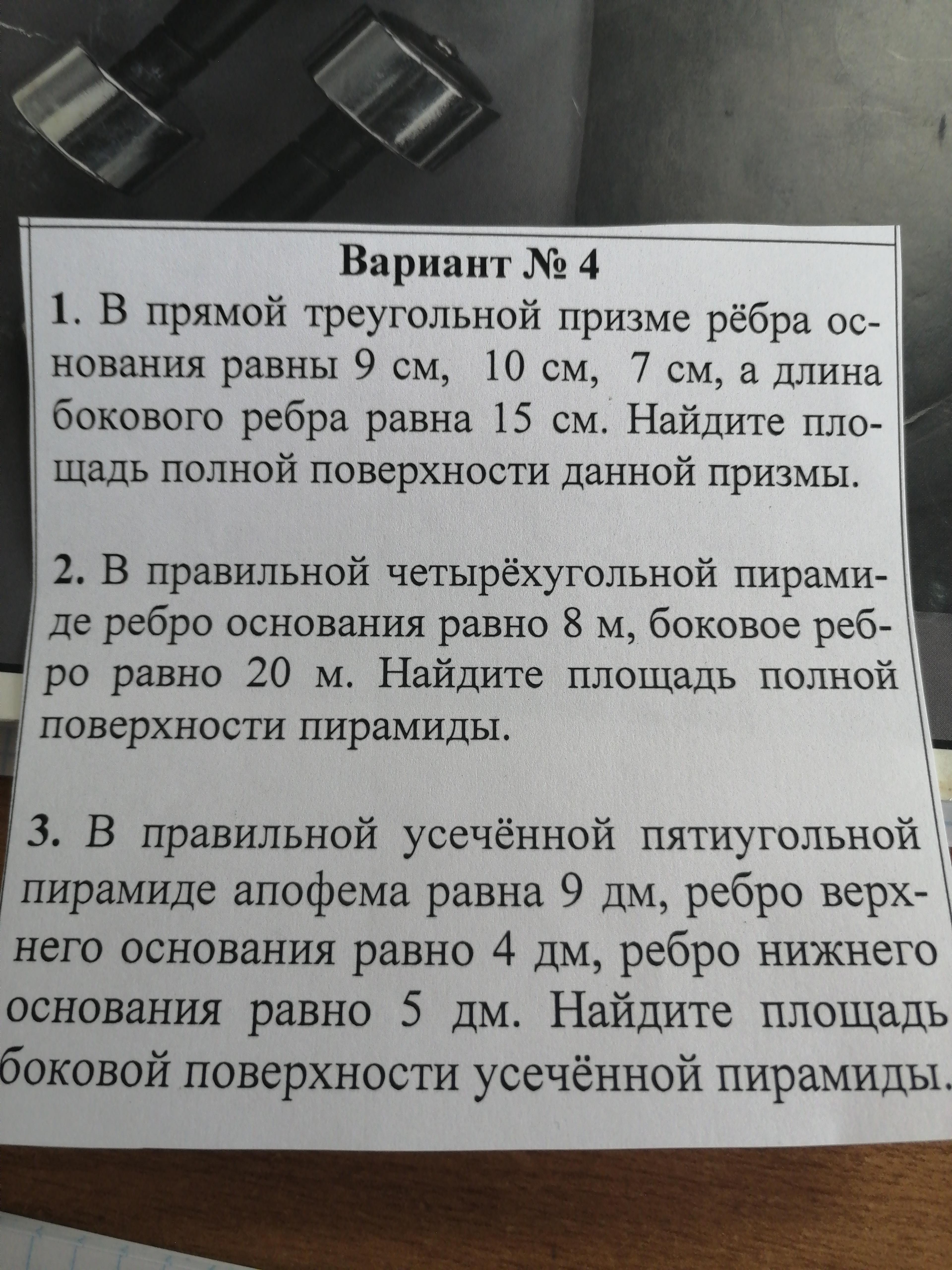 1.В прямой треугольной призме ребра основания равны 9см, 10см ,7см, а длина бокового ребра равна 15 см. Найдите площадь полной поверхности данной призмы.