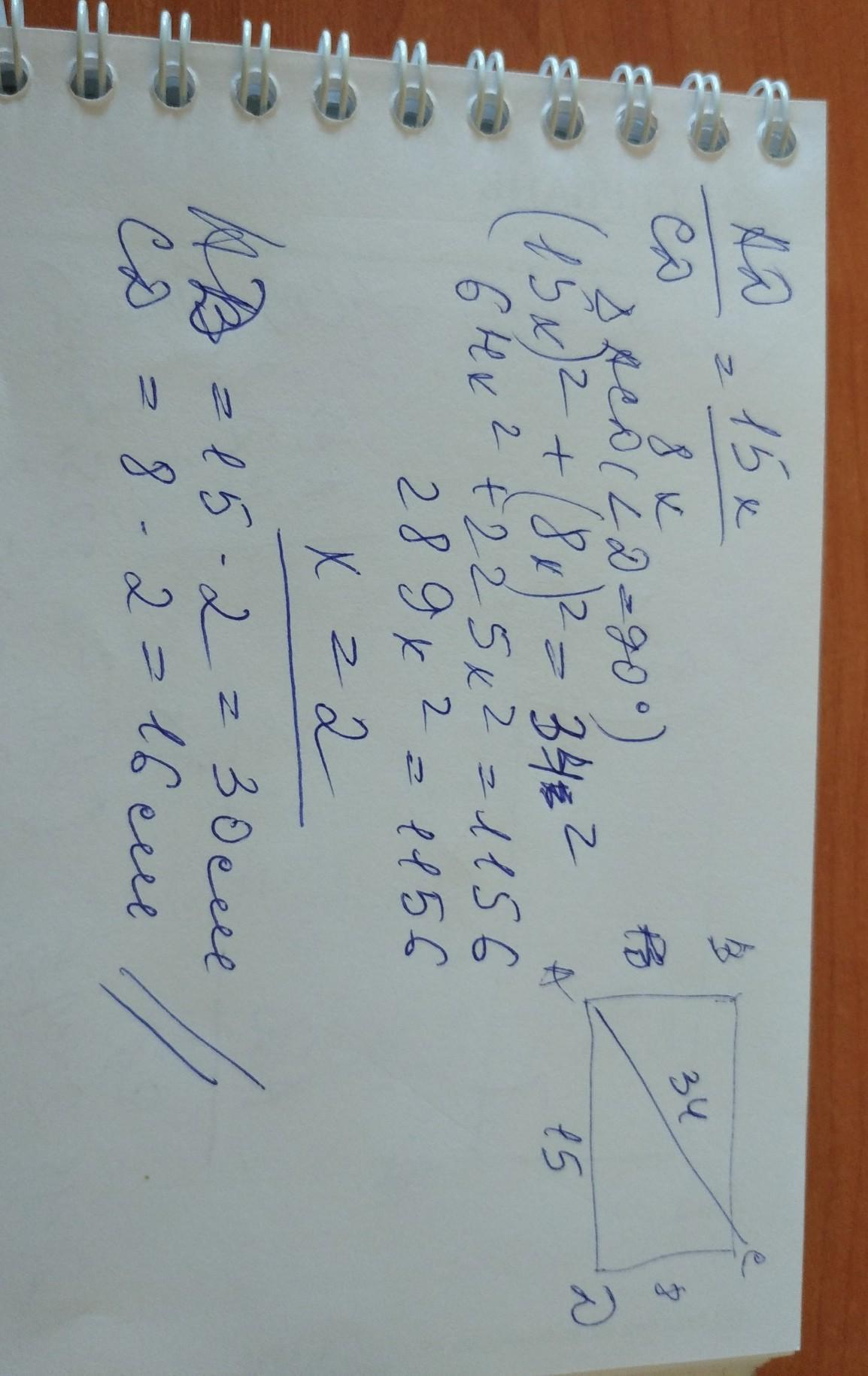 діагональ прямокутника дорівнює 34 см. знайдіть сторони прямокутника, якщо їх довжини відносяться як 15:8