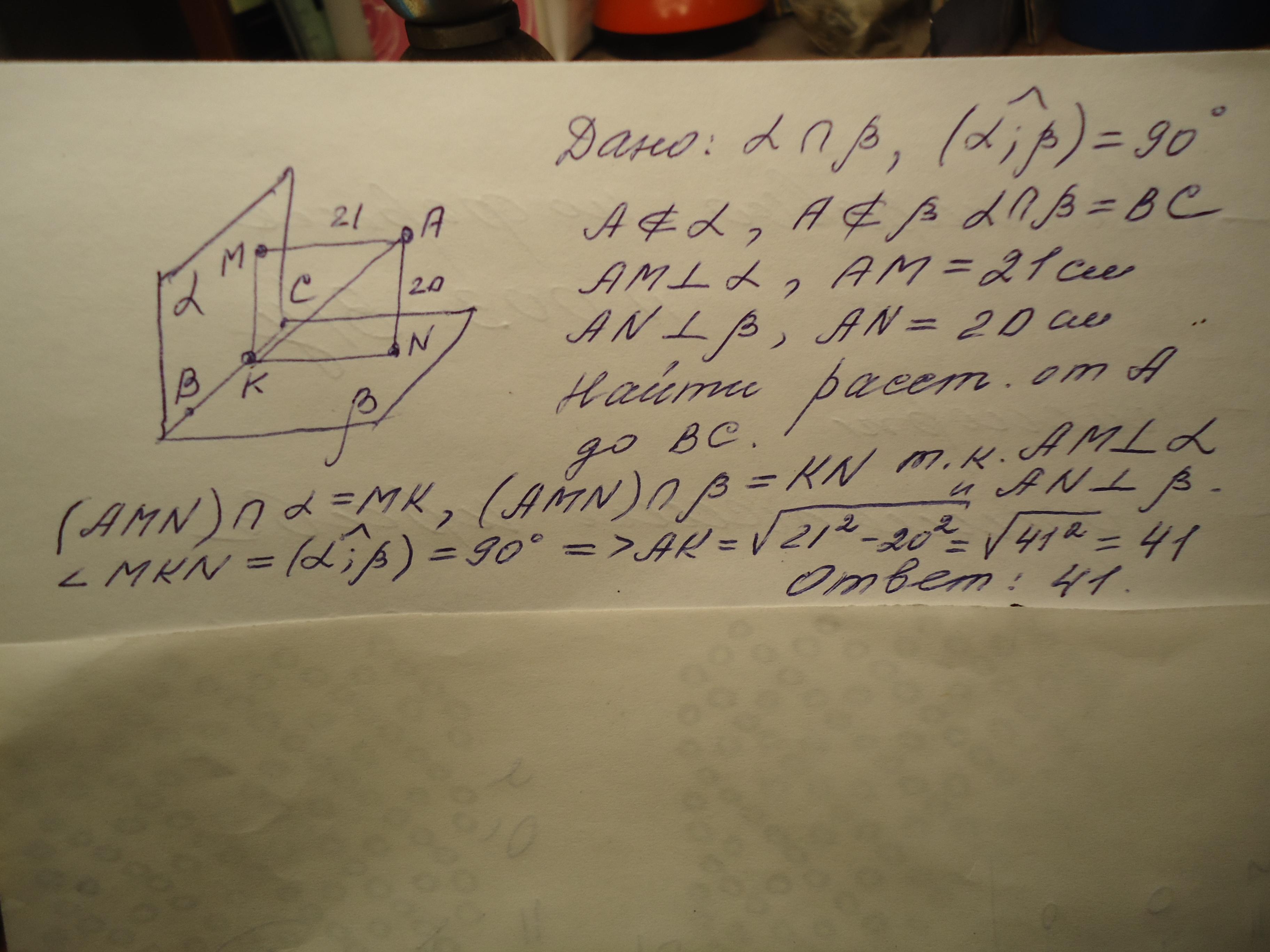 Дві площини взаємно перпендикулярні. Точка А відділена від них на 20см і 21 см. Знайдіть відстань від точки А до лінії перетину цих площин