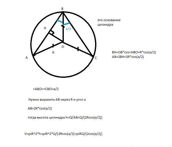 Через образующую цилиндра проведены два сечения угол между ними A(альфа), а площадь каждого сечения Q. Радиус цилиндра равен R. Найти объём цилиндра.