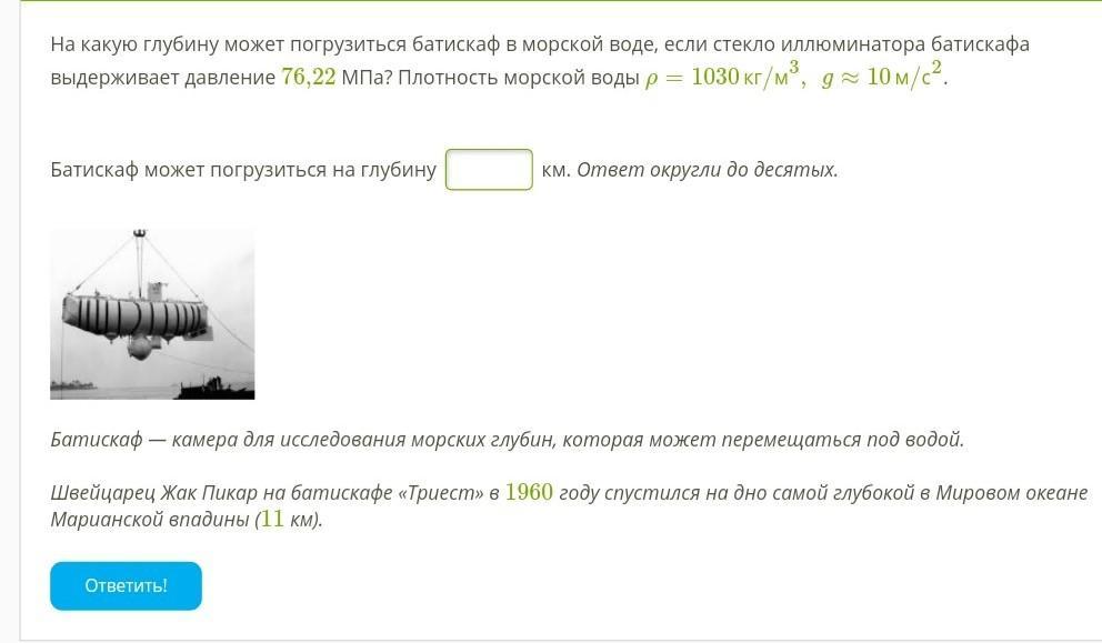 P=ро(плотность)*g*h; h=p/(ро*g); h=76,22*10^6/(10*1030)=74*10^2=7400 метров=7,4 км.