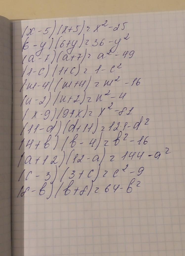 (x-5)(x+5) , (6-y)(b6+y) , (a-7)(a+7) , (1-c)(1+c) , (m-4)(m+4) , (n-2)(n+2) , (x-9)(9+x) , (11-d)(d+11) , (4+b)(b-4) , (a+12)(12-a) , (c-3)(3+c) , (8-b)(b+8)