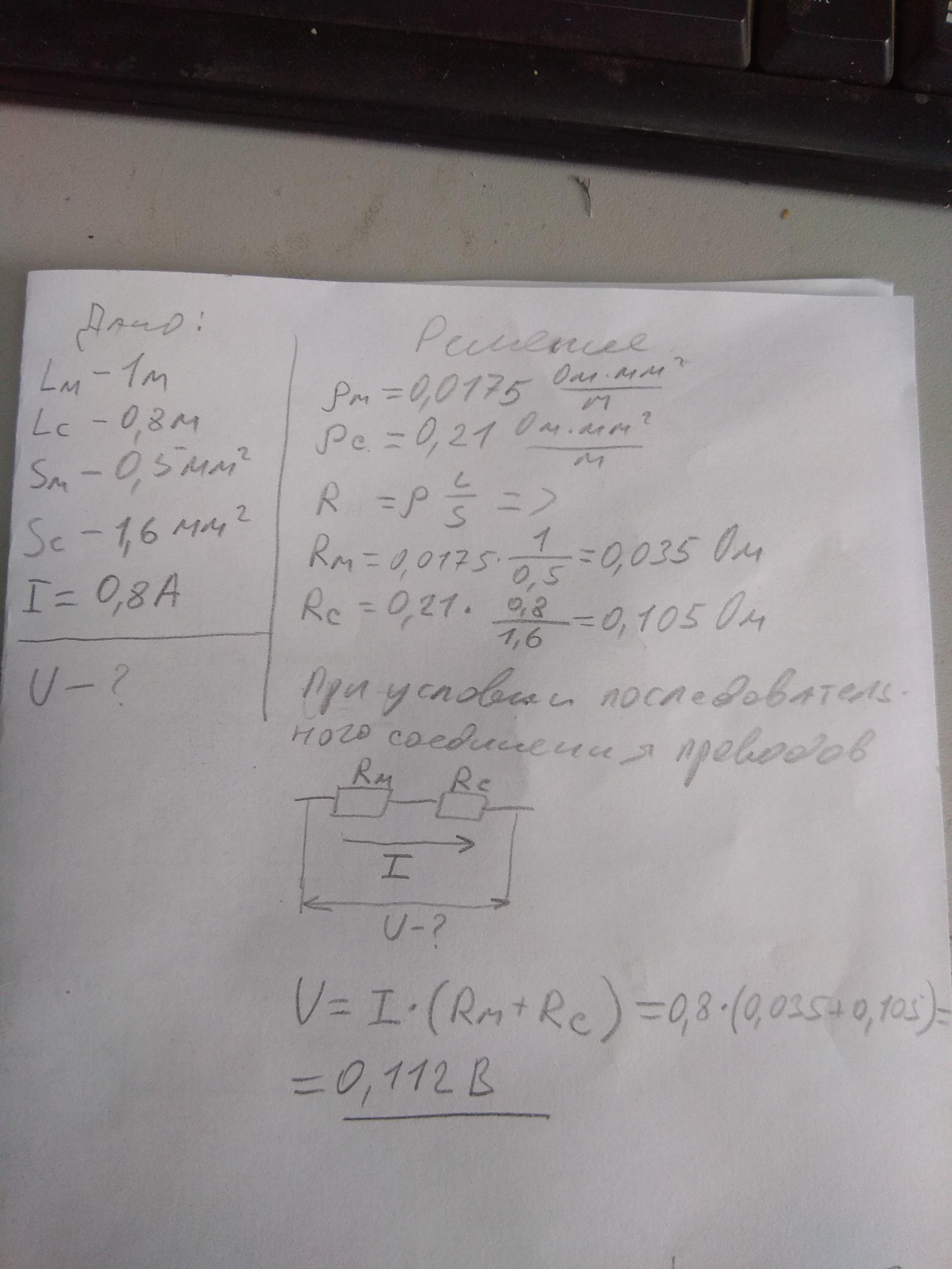 Медная и свинцовая проволоки соединены параллельно. Длина медной проволоки - 1 м, свинцовой- 0,8 м. Площадь поперечного сечения медной проволоки 0,5 мм^2, свинцовой- 1,6 мм^2. Володя хочет получить силу тока 0,8 А, какое напряжение к проволокам ему нужно подвести?