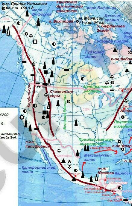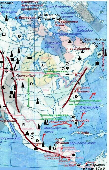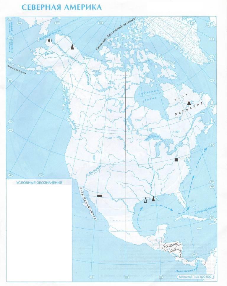 Нанести на контурную карту Северной Америки равнины, горные территории, реки, озера материка. Необходимо их подписать. Кроме того необходимо подписать океаны, омывающие материк. Не забудьте про условные знаки.