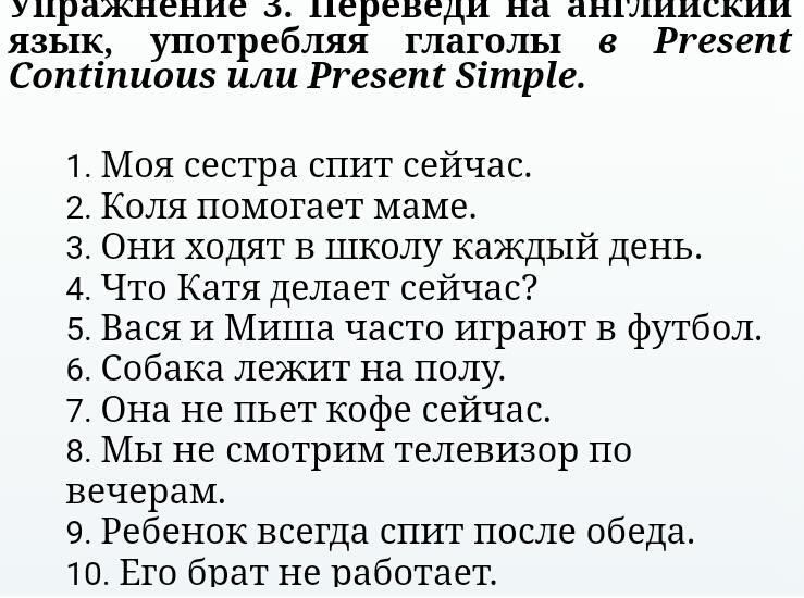 . Переведи на английский язык, употребляя глаголы в Present Continuous или Present Simple.