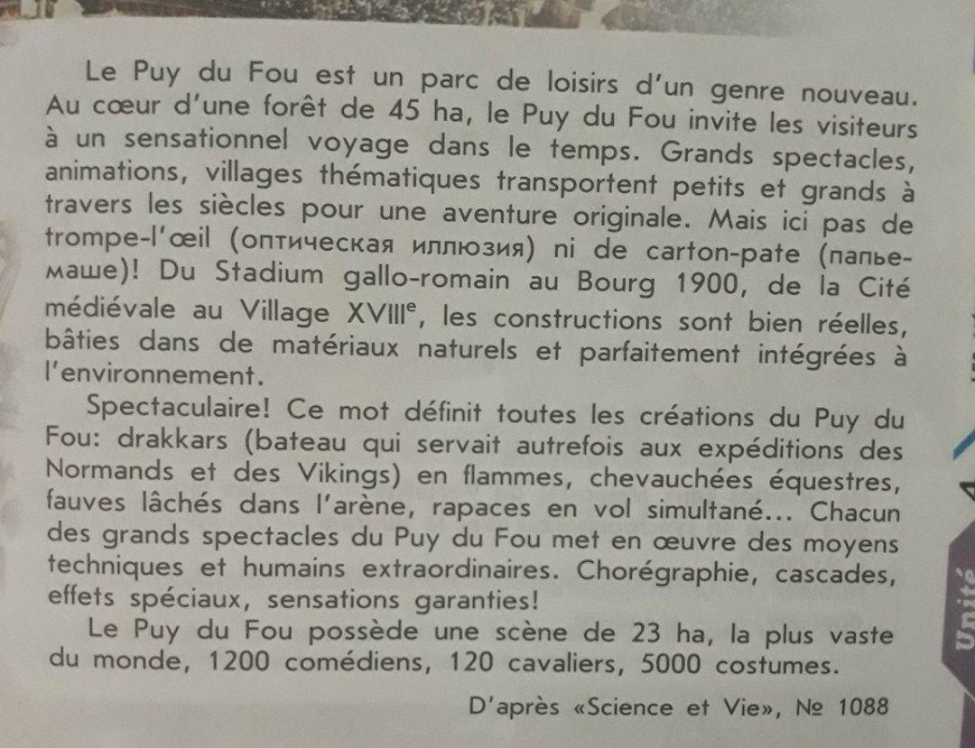 це новий вид парку дозвілля. В основі лісу площею 45 га, Пуй дю Фу запрошує відвідувачів в сенсаційну подорож часом. Чудові шоу, розваги, тематичні села транспортують молодих та старих через століття для оригінальної пригоди. Але тут ніякого шахрайства (onTHueckaa unniO3na) чи картону (nanbe- mawe)! Від гало-римського стадіону до Бургу 1900 року, від середньовічного міста до XVII селища "споруди дуже справжні, побудовані з природних матеріалів та чудово інтегровані в навколишнє середовище. Видовищне! Це слово визначає всі творіння Puy du Fou: дракакари (човен, який колись використовувався для експедицій Нормана та Вікінгів) у полум'ї, верховій їзді, диких звірів, випущених на арену, хижих птахів при одночасному польоті ... Кожне з великих шоу у Пуй дю Фу використовує технічні та людські ресурси Хореографія, водоспади, спецефекти, гарантовані сенсації! Ле Пуй дю Фу має 23-гектарний етап, найбільший у світі, 1200 акторів, 120 вершників, 5000 костюмів.