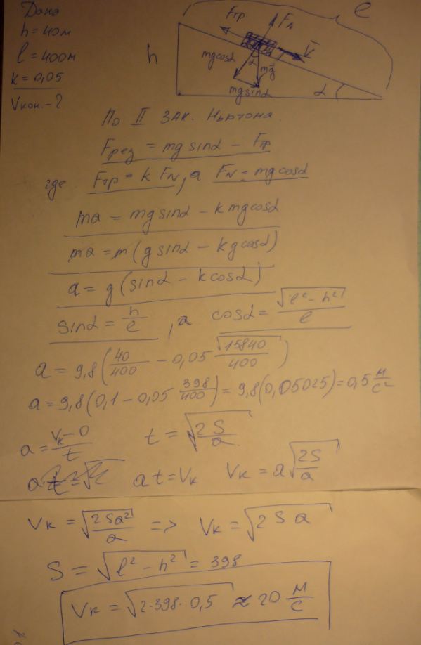 Вагон спускается с сортировочной горки без начальной скорости. Высота сортировочной горки 40 м, длина спуска 400 м. Коэффициент трения колёс вагона о рельсы составляет 0,05. Определите скорость,которую приобретает вагон в конце сортировочной горки.
