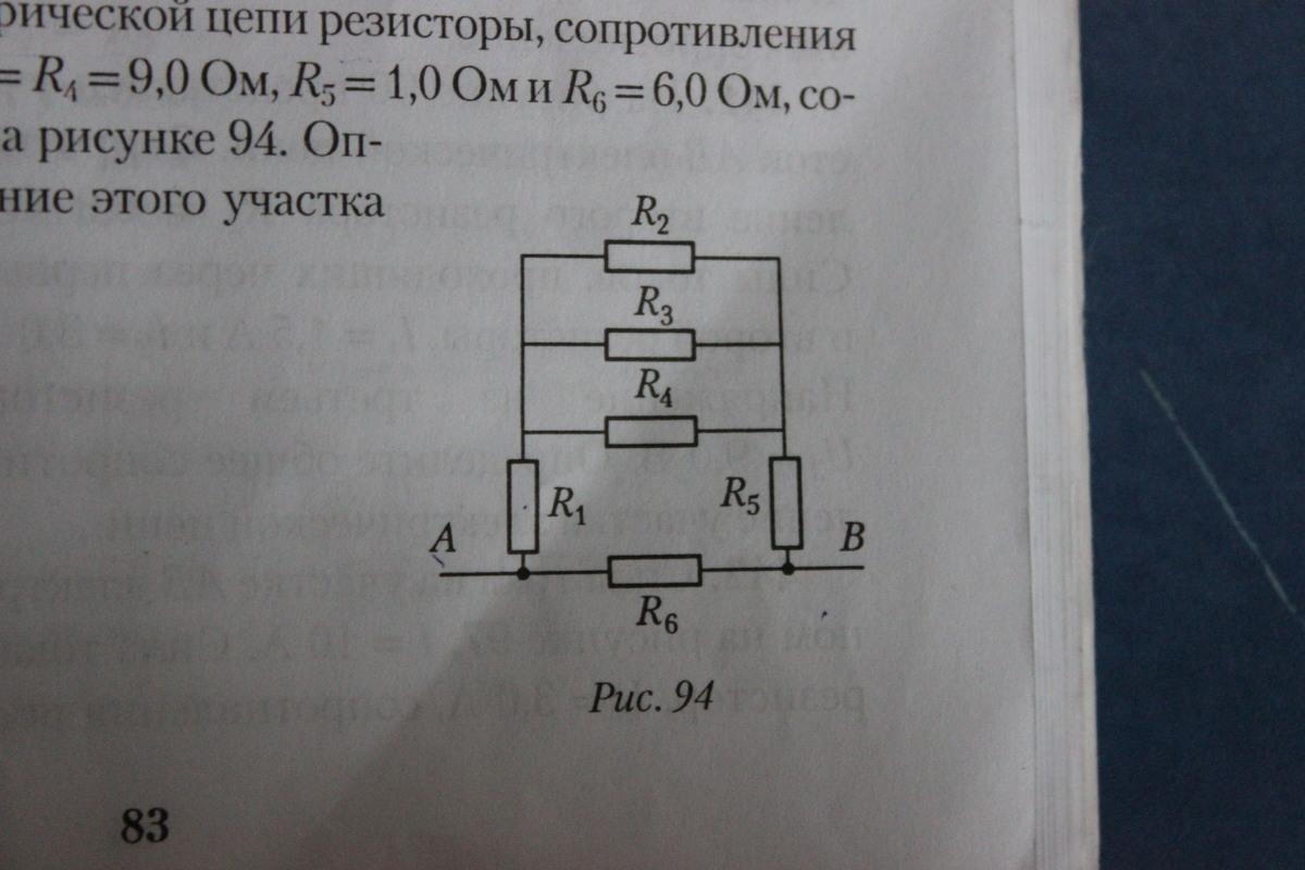 На участке АВ электрической цепи резисторы,сопротивление которых R1=2 Ом, R2=R3=R4=9 Ом, R5=1 Ом, R6=6 Ом, соединены так,как показано на рисунке. Определите общее сопротивление этого участка.