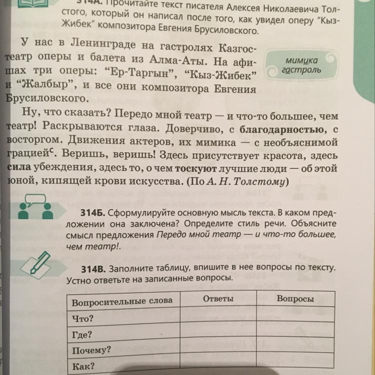 314В. Заполните таблицу, впишите в нее вопросы по тексту.
