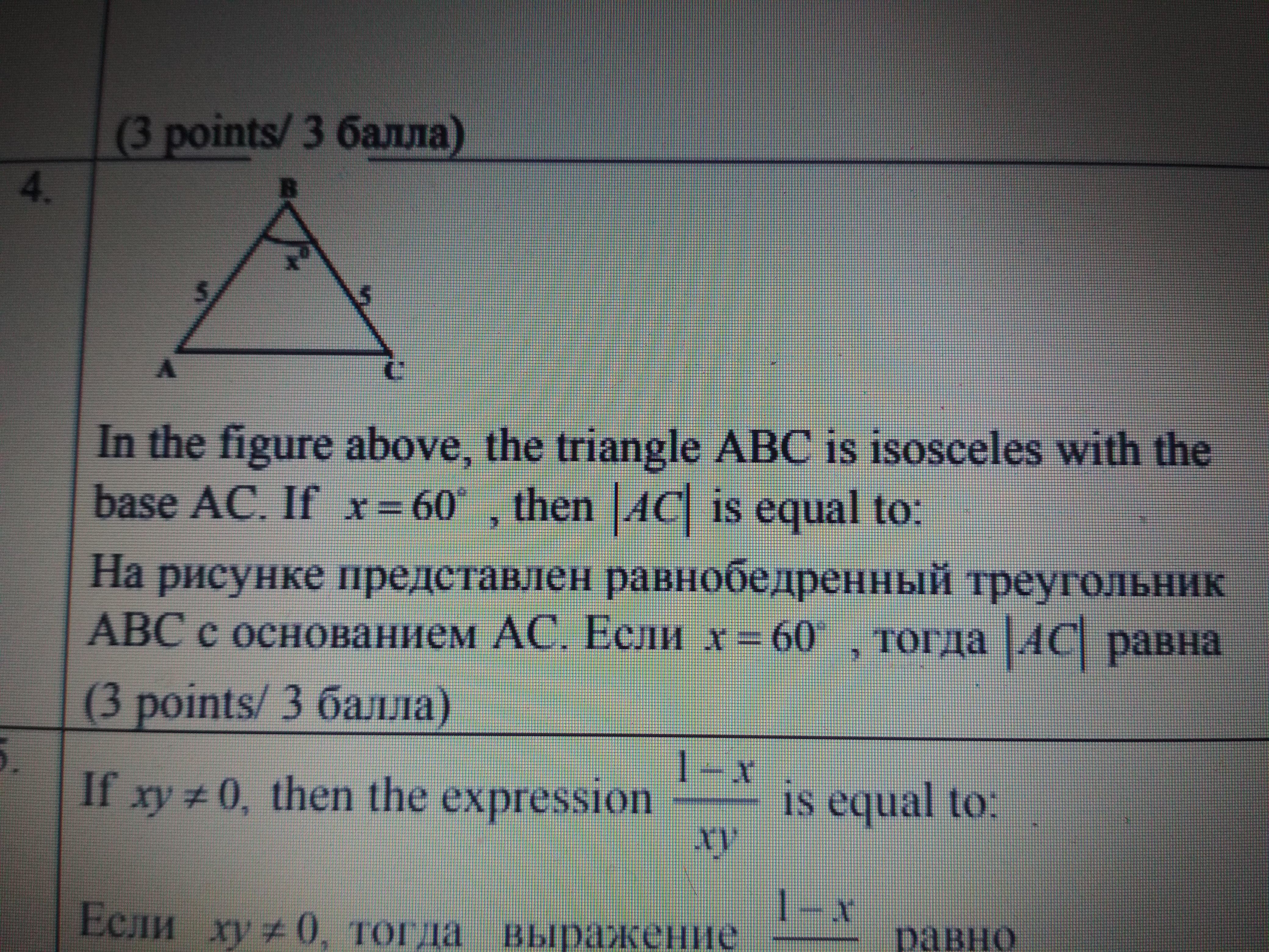 Так как боковые стороны равны по 5, треугольник равнобедренный. Следовательно, углы при основании равны. Опираясь на то, что сумма углов треугольника равна 180°, понимаем, что углы при основании также по 60°. Значит треугольник равносторонний. А значит АС = 5.