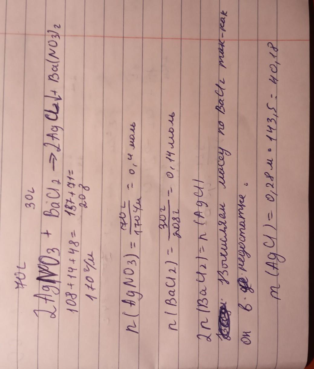 Определить массу осадка образовавшегося при взаимодействии 70 г нитрата серебра с 30 г хлорида бария.
