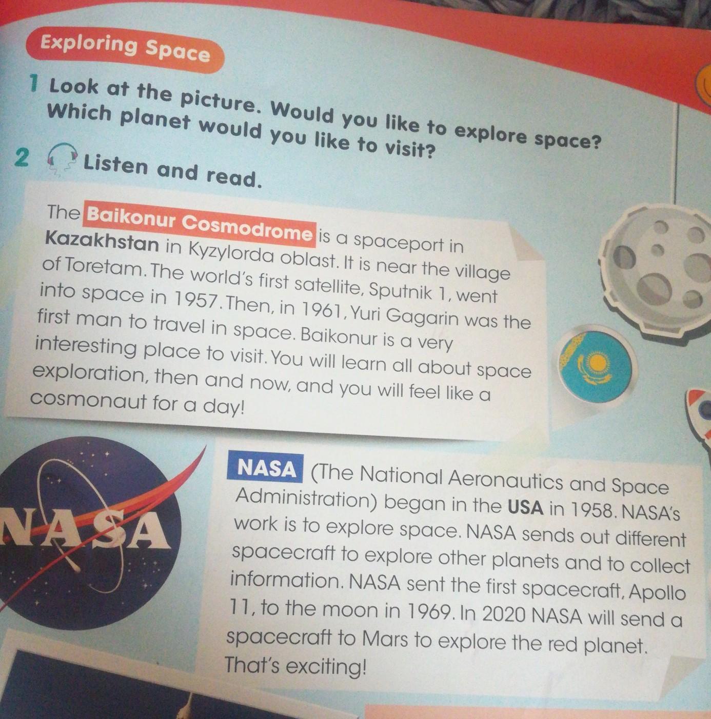 Космодром Байконур - это космодром в Казахстане в Кызылординской области. Это недалеко от деревни Торетам. Первый спутник в мире, Спутник-1, вышел в космос в 1957 году. Тогда, в 1961 году, Юрий Гагарин был первым человеком, который полетел в космосе. Байконур - очень интересное место для посещения. Вы узнаете все об освоении космоса тогда и сейчас, и вы будете чувствовать себя космонавтом на один день! НАСА (Национальное управление по аэронавтике и исследованию космического пространства) начало свою деятельность в США в 1958 году. Работа НАСА заключается в исследовании космоса. НАСА отправляет различные космические корабли для исследования других планет и сбора информации. НАСА отправило первый космический корабль «Аполлон-11» на Луну в 1969 году. В 2020 году НАСА отправит космический корабль на Марс для исследования красной планеты. Это захватывающе!