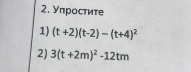 (t+2)(t-2)-(t+4)^2=(t^2-4)-(t^2+8t+16)=-8t-20=-4(2t+5)\\\3(t+2m)^2-12m=3(t^2+4tm+4m^2)-12, tm=3t^2+12m^2=3(t^2+4m^2)