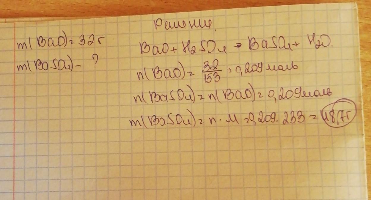 Какая масса сульфата бария образуется при взаимодействии 32г. оксида бария с избытком серной кислоты?
