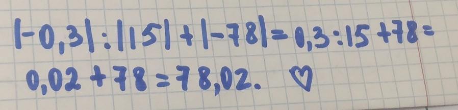|−0,3|:|15|+|−78|= 0,3 : 15 + 78 = 0,02 + 78 = 78,02.