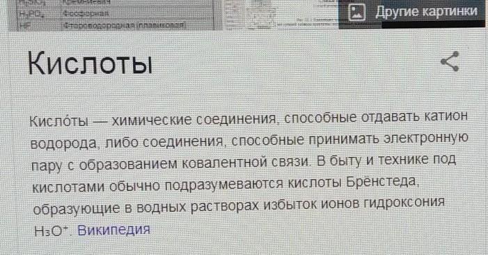 Кисло́ты — химические соединения , способные отдавать катион водорода (кислоты Брёнстеда), либо соединения, способные принимать электронную пару с образованием ковалентной связи (кислоты Льюиса).