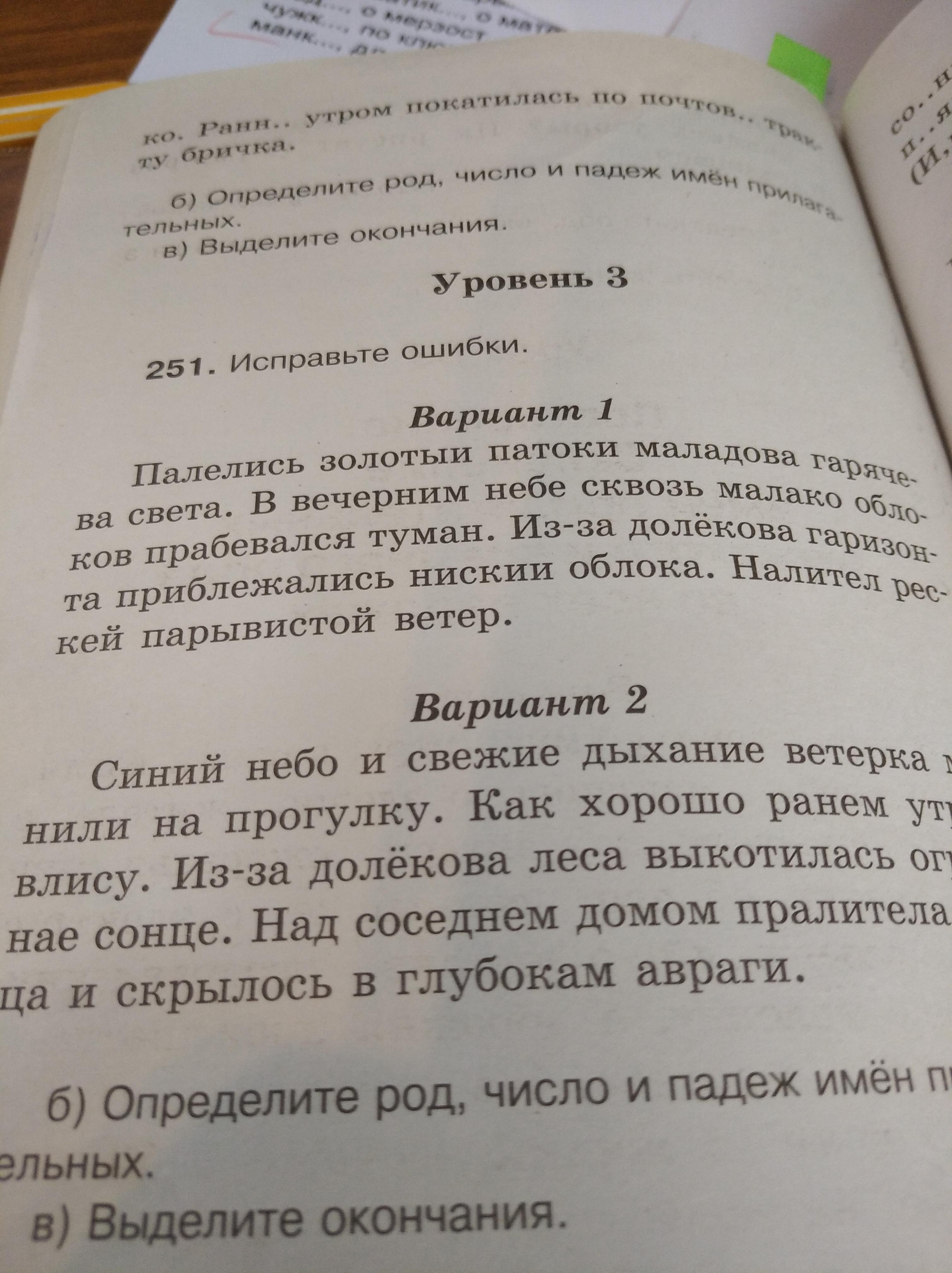 В 2. Синее (ср.р., ед.ч., И.п.) небо и свежее (ср.р., ед.ч., И.п.) дыхание ветерка манили на прогулку. Как хорошо ранним (ср.р., ед.ч., Т.п.) утром в лесу. Из-за далёкого (м.р., ед.ч., Р.п.) леса выкатилось огромное (ср.р., ед.ч., И.п.) солнце. Над соседним (м.р., ед.ч., Т.п.) домом пролетела птица и скрылась в глубоком (м.р., ед.ч., П.п.) овраге.