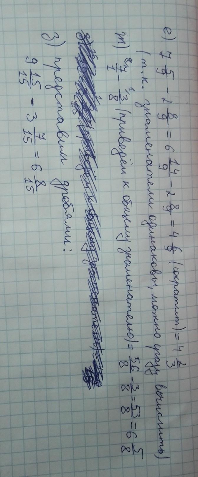 е) 7 5/9-2 8/9=6 14/9-2 8/9(т.е. чтобы было легче считать мы убрали от 7 целое и добавили 9 к дроби)=4 6/9 сократим=4 2/3