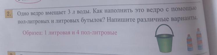Одно ведро вмещает 3 л воды. Как наполнить это ведро с помощью пол-литровых и 1-литровых бутылок? Напишите различные варианты.
