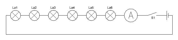 Нарисовать электрическую схему елочной гирлянды,состоящий из 6 лампочек, ключа,гальванического элемента,где все элементы соединены последовательно.Куда и как нужно включить амперметр,чтобы измерить силу тока в данной цепи?