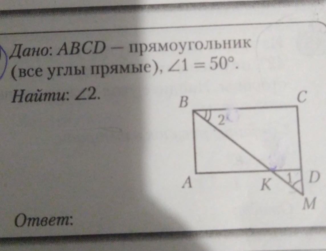 ∠2 = ∠СВК = ∠В - ∠АВК = 90° - 50° = 40°
