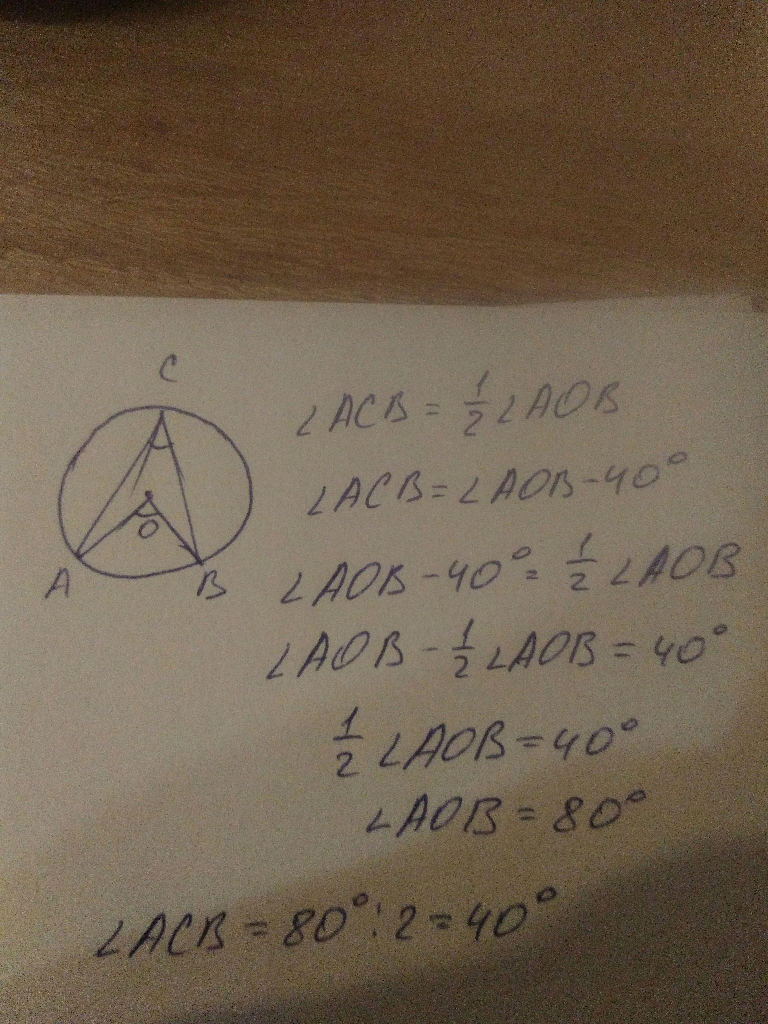 Вписаний кут на 40° менший від центрального кута що спирається на ту саму дугу кола. Яка грудусна міра центрального кута