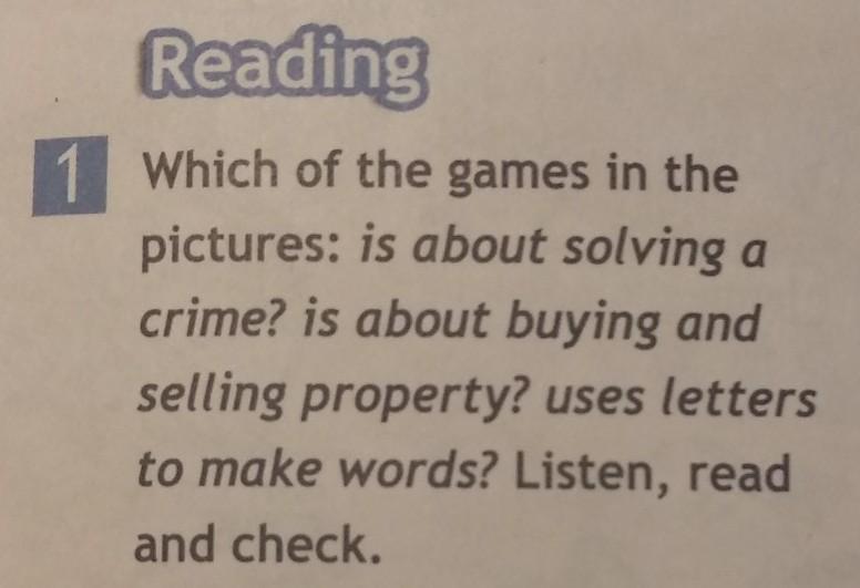 Какая из игр на картинках: о раскрытии преступления? о покупке и продаже недвижимости? использует буквы, чтобы сделать слова? Слушай, читай и проверяй.