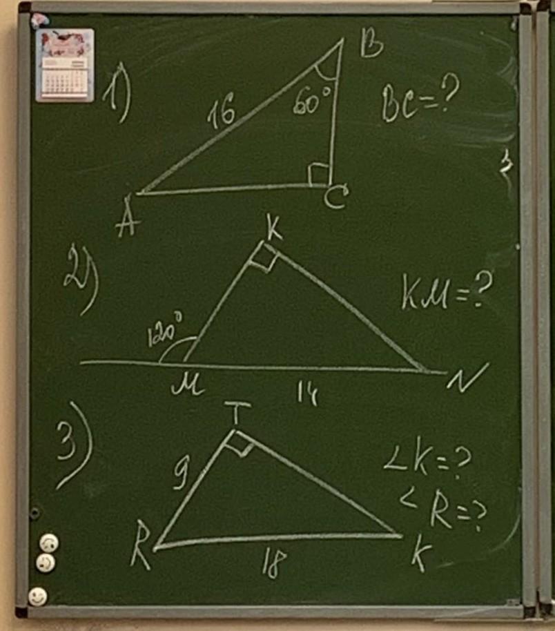 1)Решение угол С=90град угол В равен 60 =)(слудеут) что угол А равен 30=)правило что в прямоугольном тряугольник угол 30 крадусов прилежайщей к гипотенузе находит противолежащию сторону этому углу и она равна половине гипотенузы = 8см