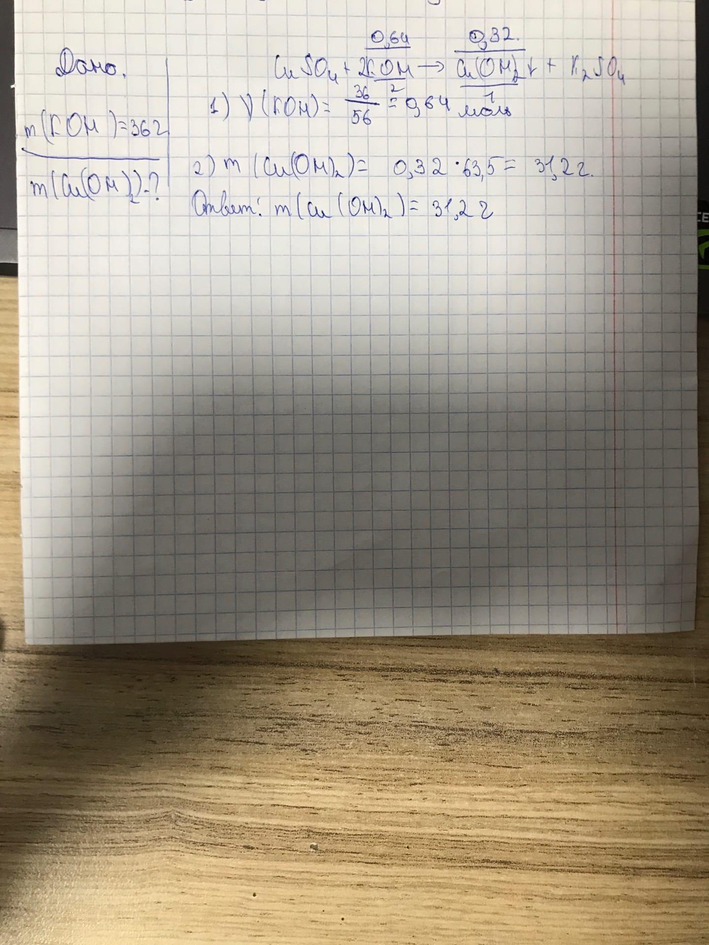 Какая масса осадка образуется при взаимодействии сульфата меди с гидроксидом калия массой 36 грамм?
