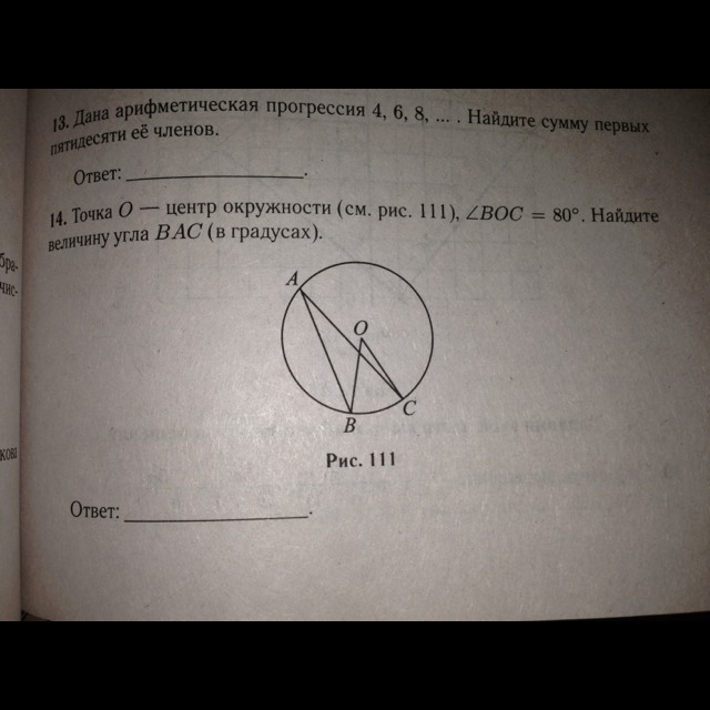 Угол ВОС =80 градусов.Найдите величину угла ВАС (в градусах)