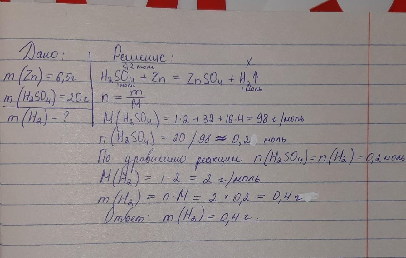 6,5 г цинка поместили в раствор, содержащий 20 г серной кислоты. Рассчитайте массу выделившегося водорода.