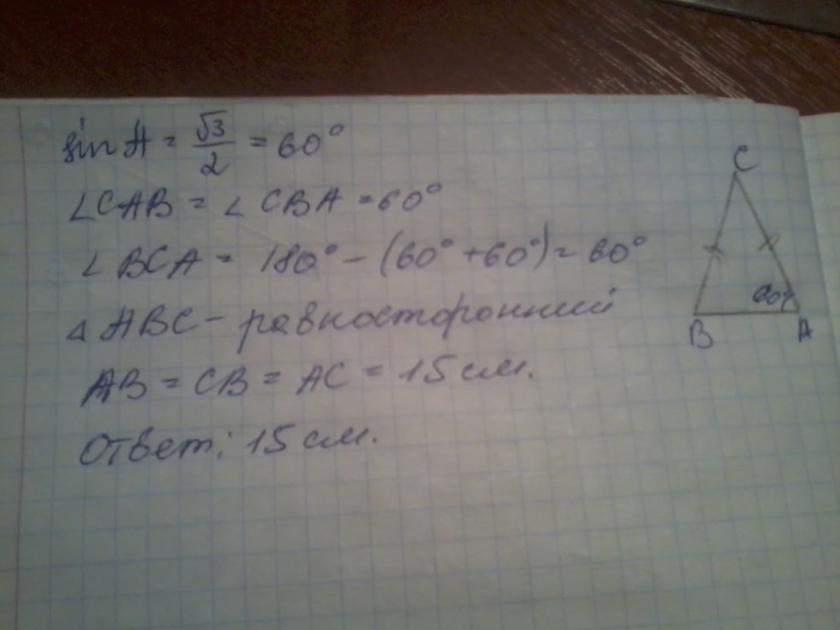 в треугольнике авс ас=вс ав=15 sinA=корню из трех деленному на 2 .найти ас