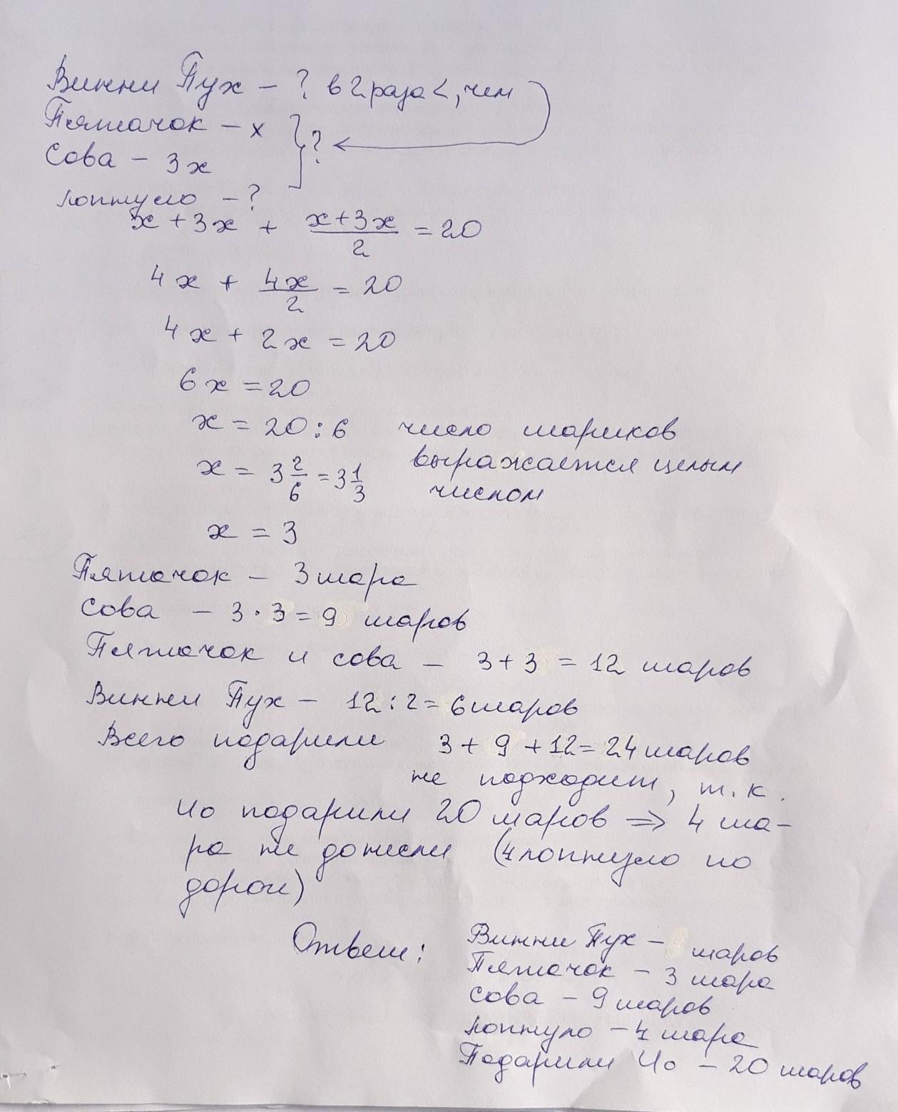 Винни-Пух,Пятачок и Сова решили подарить на день рождения Иа много воздушных шаров.Договорились что Винни принесет шариков в 2 раза меньше,чем Сова и Пятачок вместе и что Сова принесет в 3 раза больше шаров чем Пятачок.В итоге Иа подарили 20 шариков.Докажите что не менее 4 шариков лопнуло по дороге. С объяснением понятным пожалуйста