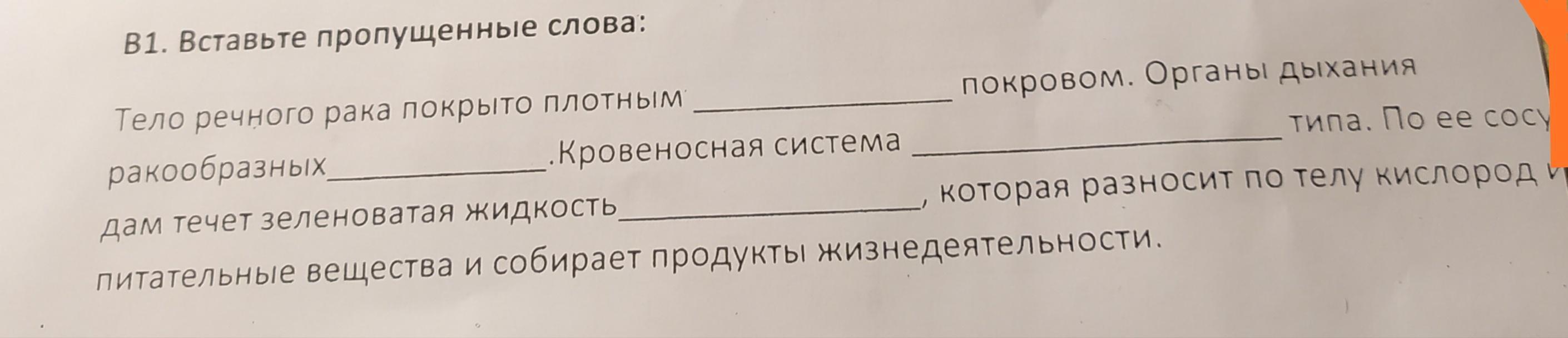 хитиновым покровом,органы дыхания-жабры, кровеносная система не замкнутая,зеленоватая жидкость-гемолимфа