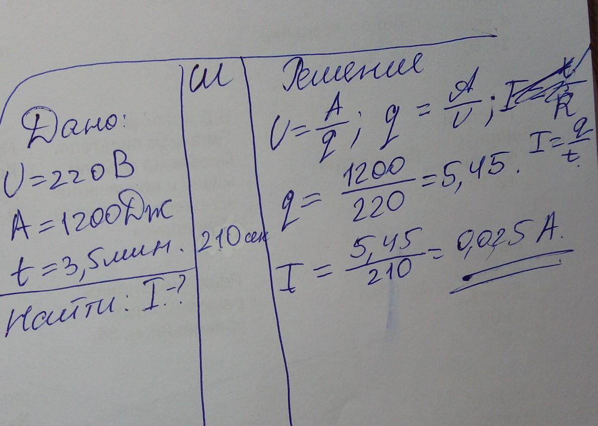В плитке подключенной к сети 220в совершается работа сила тока 1200 Дж за промежуток времени 3,5 мин. Какова сила тока в электрической плитке