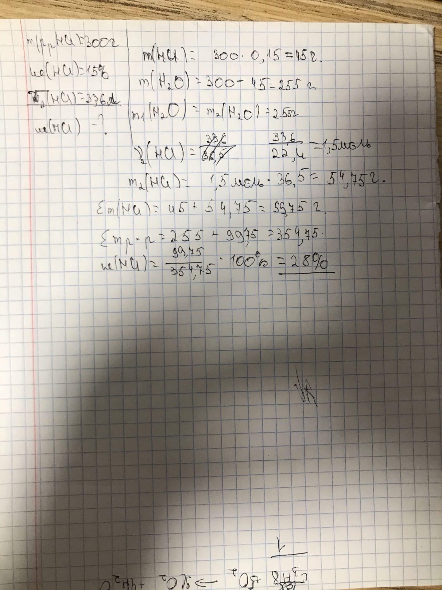в 300г 15% соляной кислоты добавили еще 33,6 л хлороводорода. Определите массовую долю соляной кислоты в полученном растворе