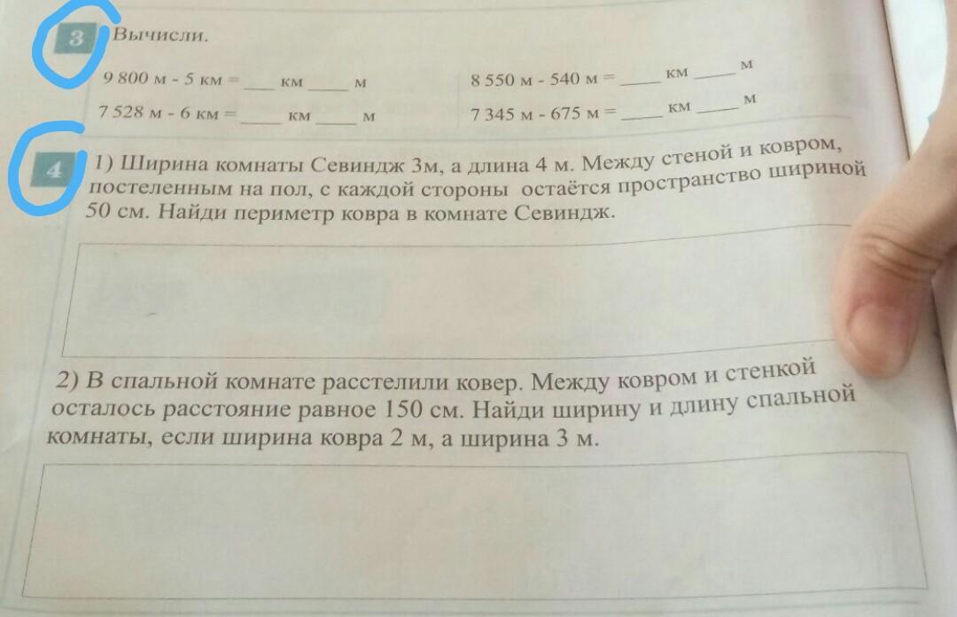 Это значит, что если ширина комнаты 3 м, а длина 4 м, то ширина ковра равна 3 м - 1 м = 2 м, а длина ковра составляет 4 м - 1 м = 3 м.