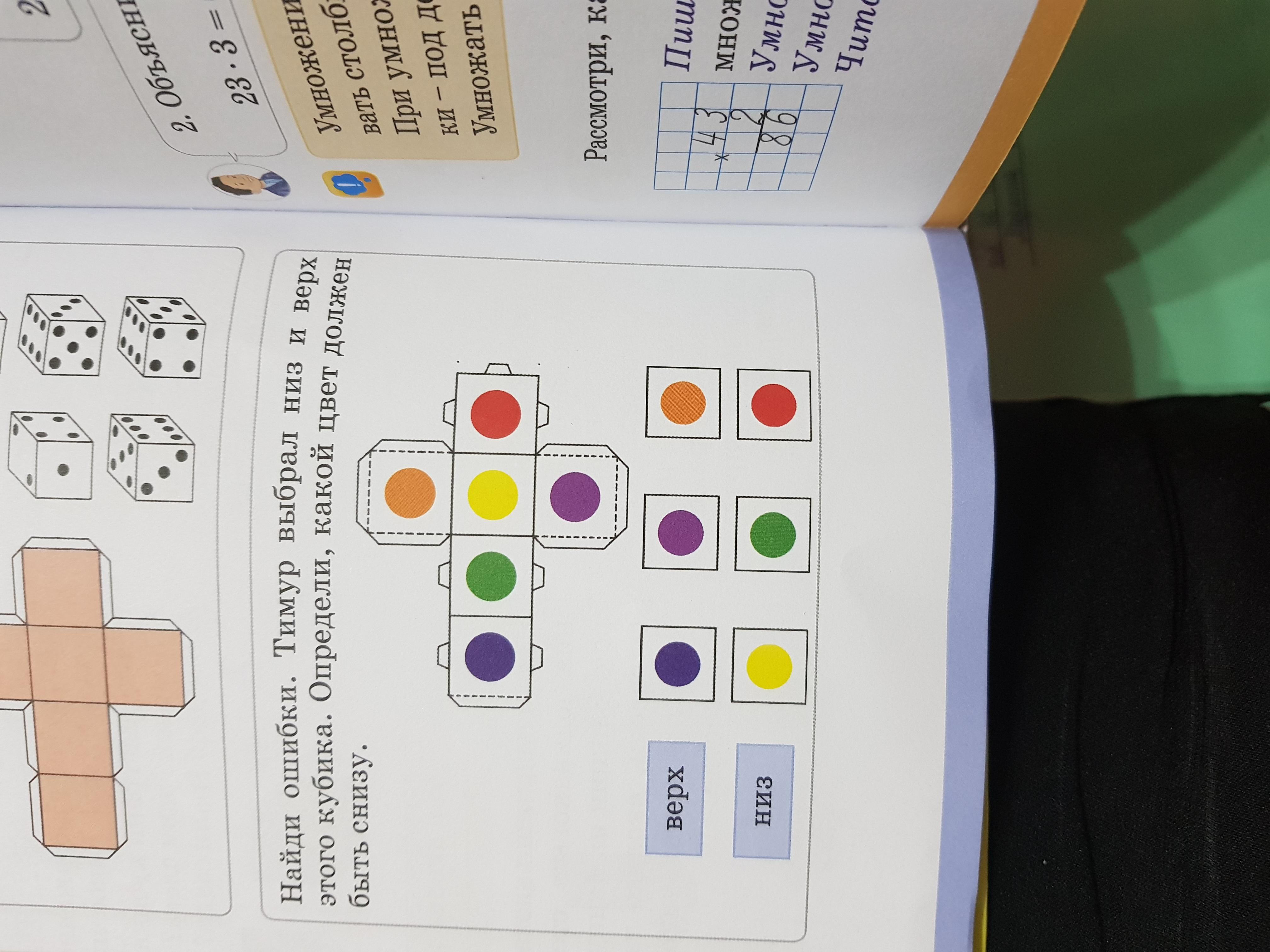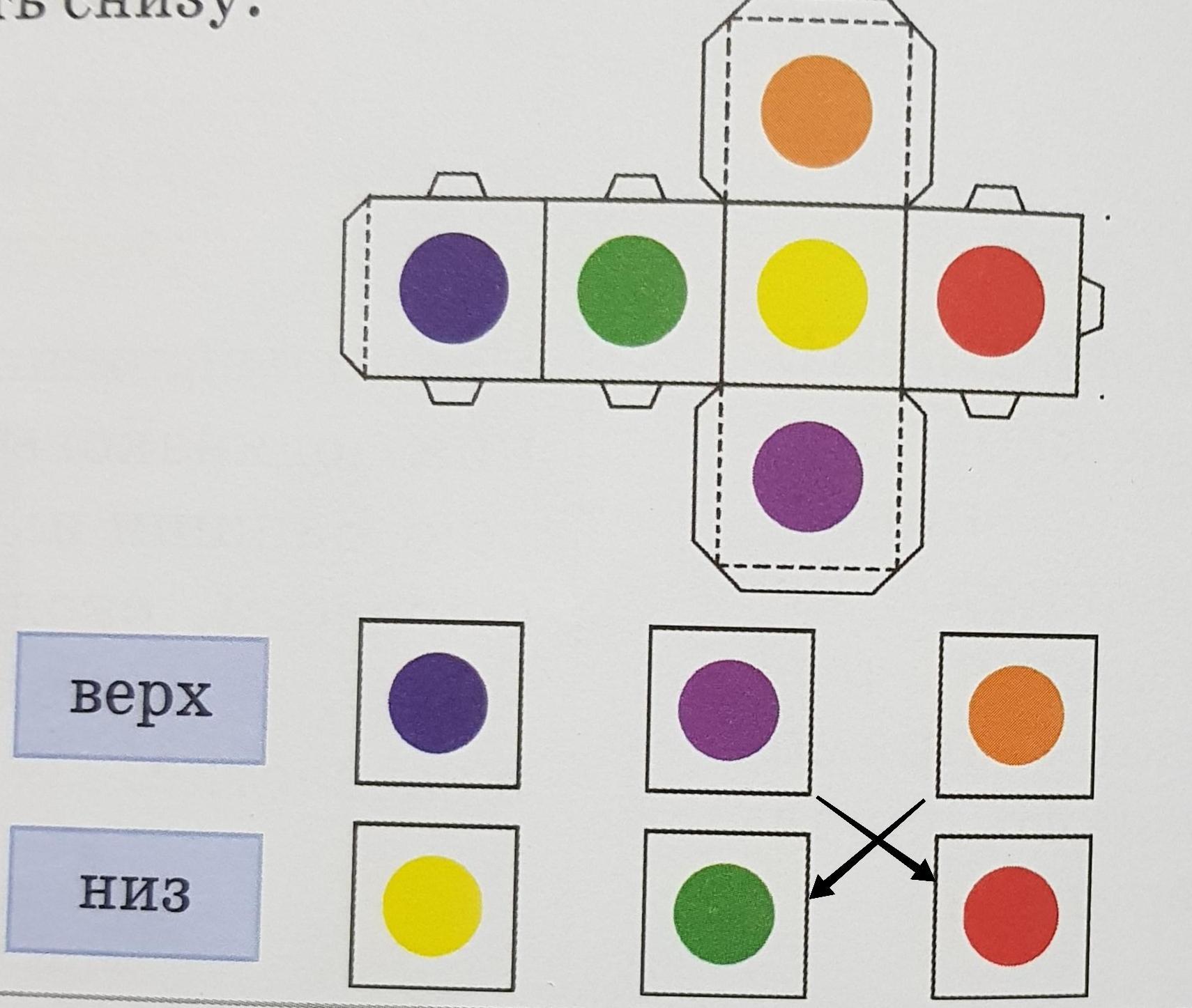 Найди ошибки. Тимур выбрал низ и верх этого кубика. Определи, какой цвет должен быть снизу