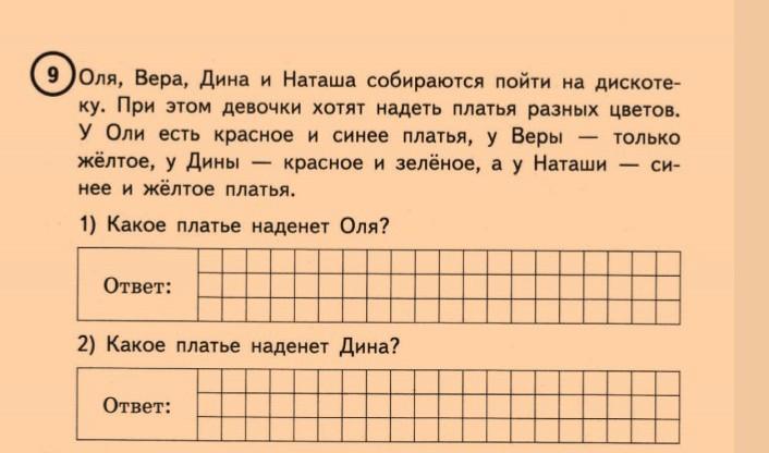 Так как у Веры есть только желтое платье, Наташа пойти в желтом не сможет и ей остается надеть синее. Тогда Оля не сможет пойти в синем и поэтому она наденет красное и так как Оля идет в красном платье, Дине остается одеть зеленое платье.