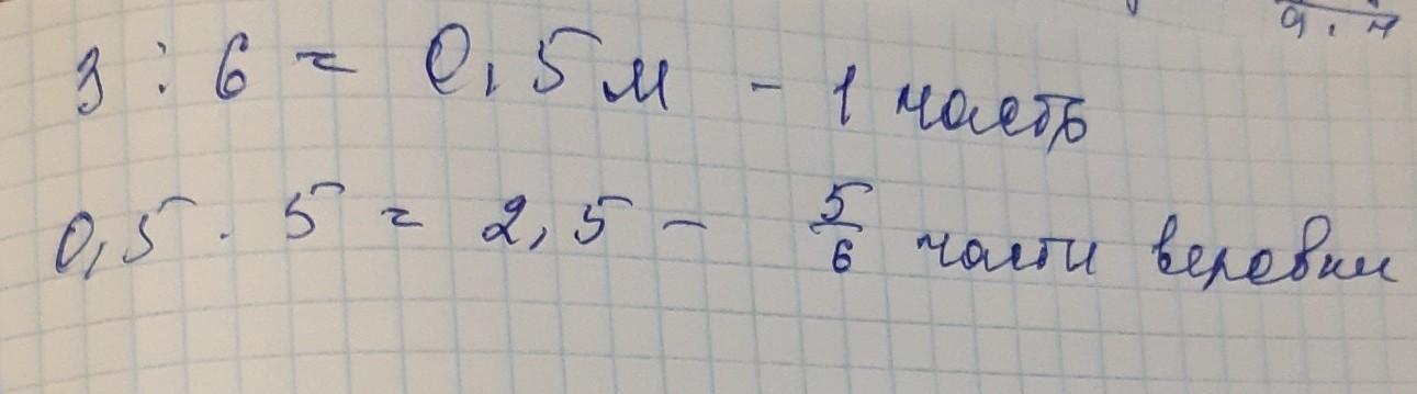 Веревку длиной 3 м разрезали на 6 равных частей. Какой длины получилась каждая часть? Найди 5/6 части веревки.
