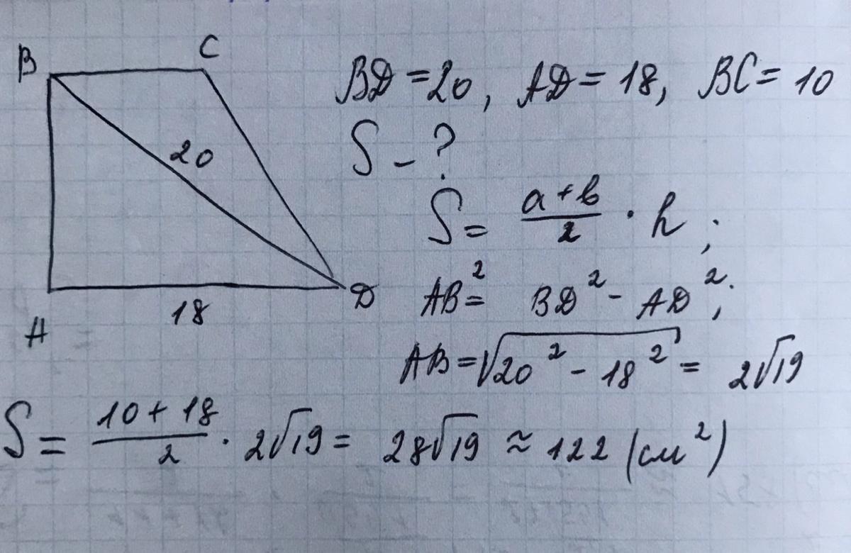 В1. В прямоугольной трапеции большая диагональ равна 20см, большее основание равно 18, меньшее основание равно 10см. Найдите площадь трапеции.