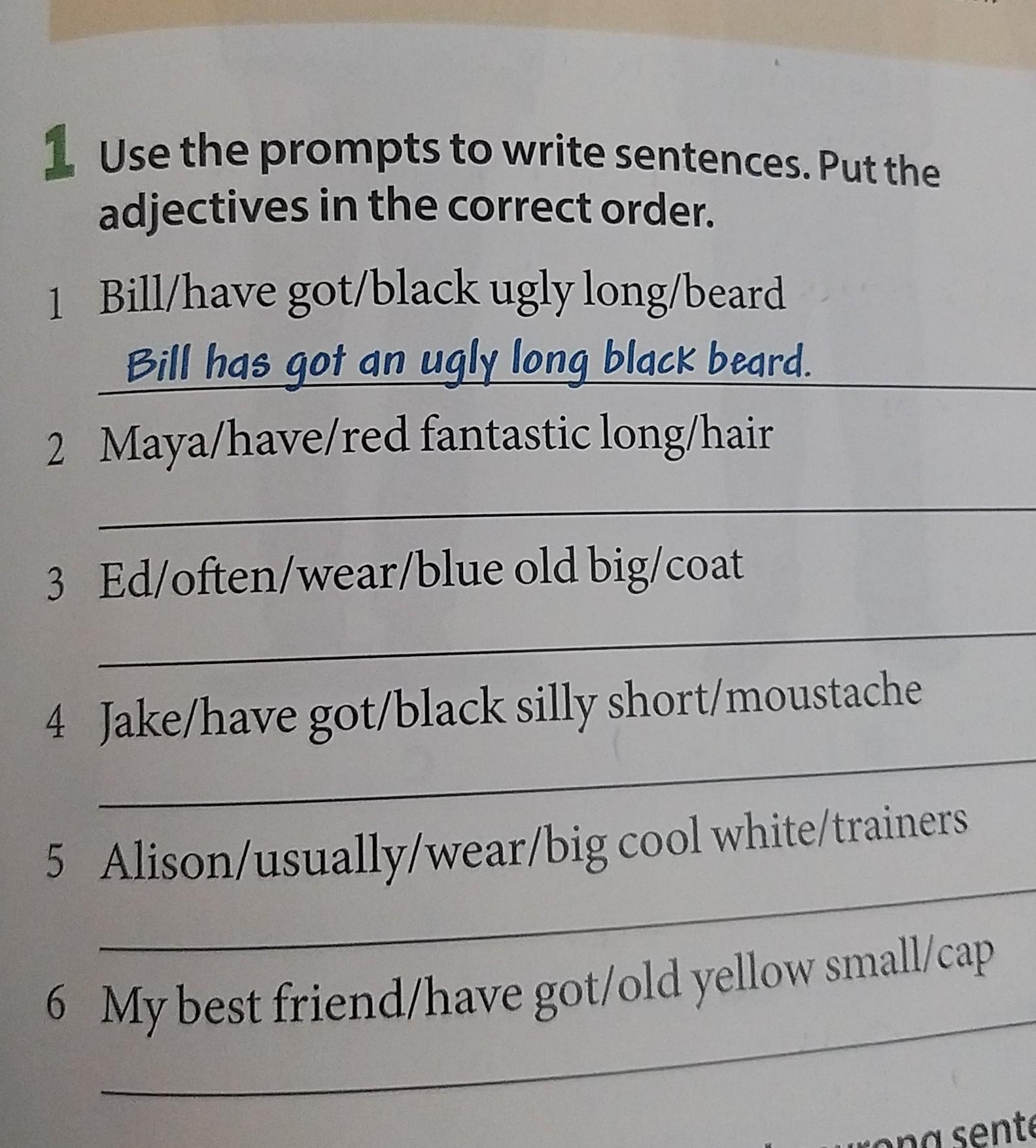 Maya has got a fantastic long red hair.Ed often wear an old big blue coat.Jake has got a silly short black moustache.Alison usually wear a cool big white trainers.My best friend has got a old small yellow cap.