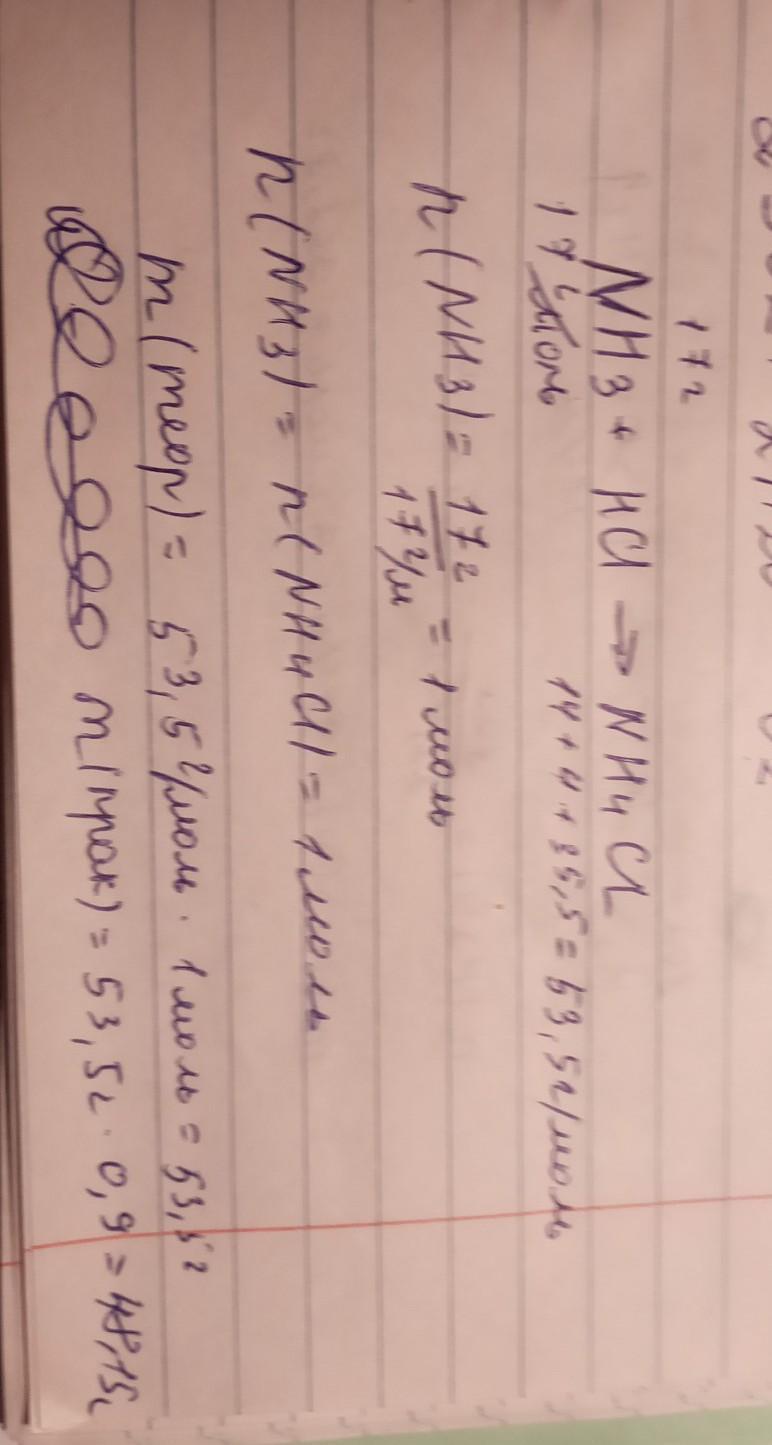 Аммиак массой: 17 г. пропустили через раствор соляной кислоты. Определить массу хлорида аммония полученного при 90% выхода.