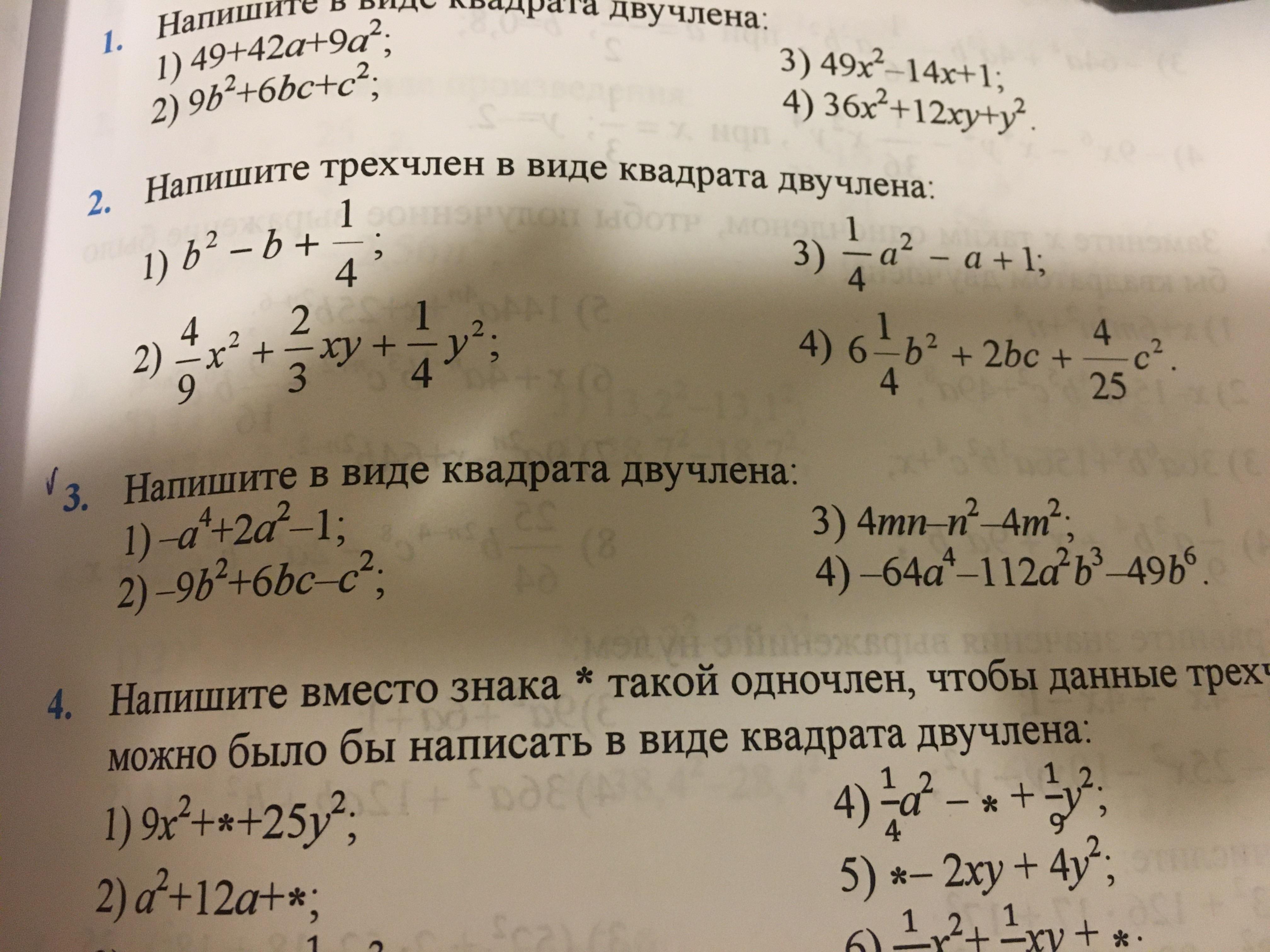 Ответ:1)-(a^2-1)^2. 2)-(3b-c)^2 .3)-(n-2m)^2 . 4)-(8a^2+7b^3)^2